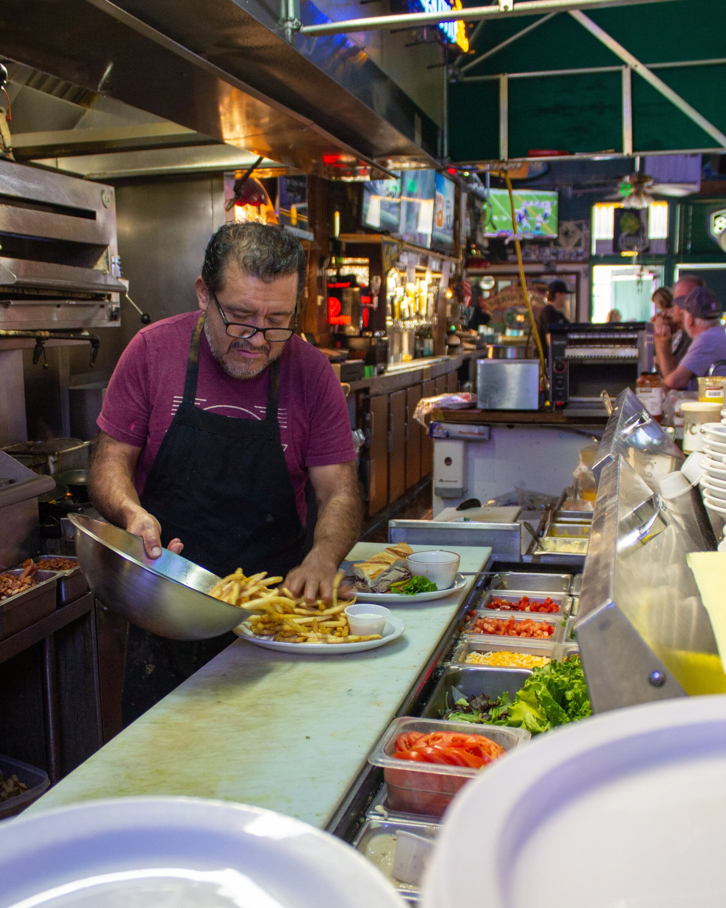 Sunshine Saloon has a charcoal grill that can cook up your favorite meals, made to order just the way you like it.